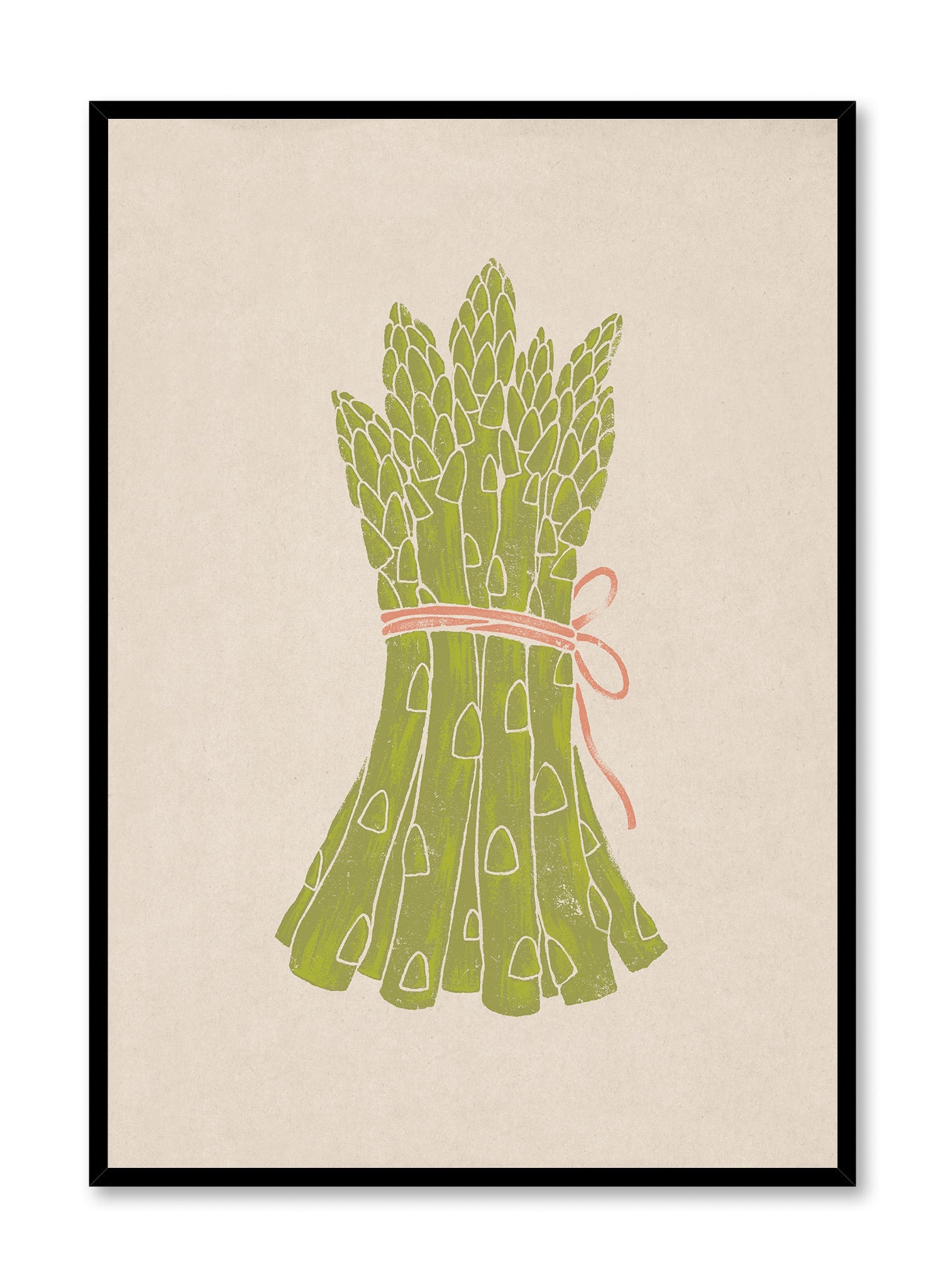 A neatly tied bunch of fresh asparagus takes center stage in this print, its lively green tones accented with hand-drawn white highlights that capture its natural texture. The soft neutral background allows the earthy hues to shine, while the playful pink twine adds a charming, vintage touch.
